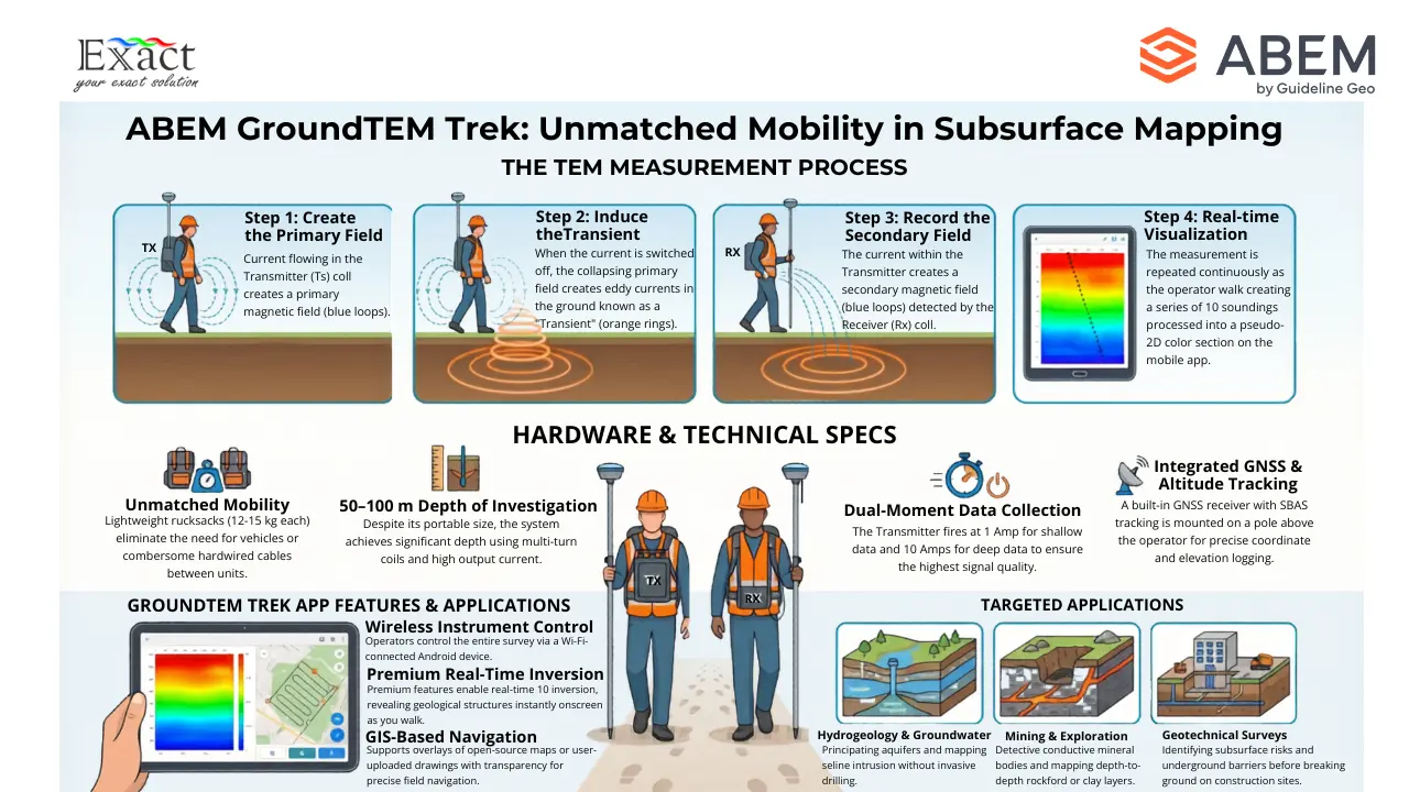 Because of this specific depth range, the ABEM GroundTEM Trek is officially applied for mineral exploration, groundwater mapping, and geotechnical surveys. If our mining operation needs to locate a shallow aquifer for our processing plant’s water supply, or if we need to map bedrock topography before building a new haul road or tailings dam, we use the exact same backpacks. We just change our walking path.